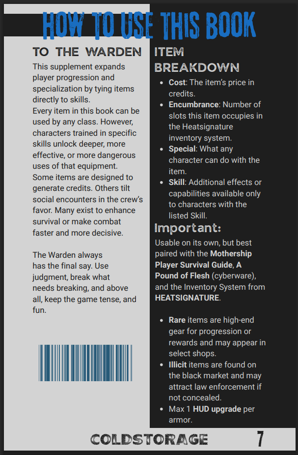 This supplement expands player progression and specialization by tying items directly to skills. Every item in this book can be used by any class. However, characters trained in specific skills unlock deeper, more effective, or more dangerous uses of that equipment.